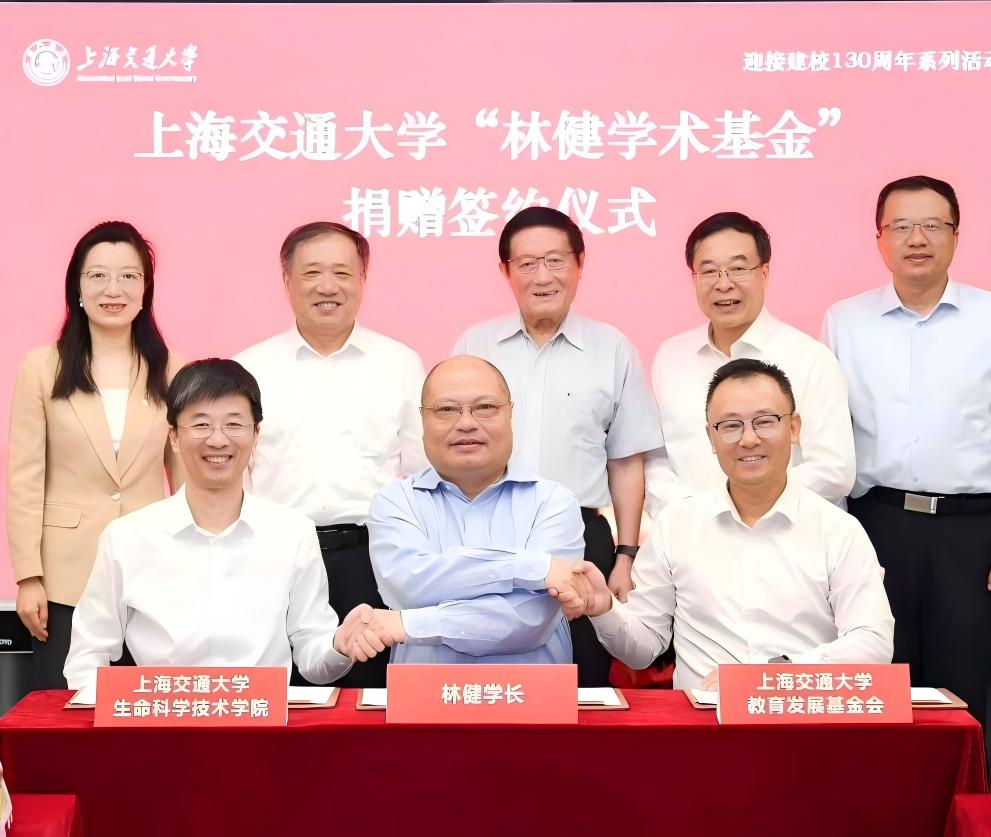 2025-092025年9月20日上午,在上海交通大学建校130周年倒计时200天之际,“爱交大•久爱你”校友及校友伉俪捐赠签约仪式在闵行校区校友服务中心举行。在“林健学术基金”捐赠签约仪式上,生命科学技术学院2010届博士校友、江苏美通制药有限公司董事长林健签约捐赠专项支持学院举办高水平学术会议,献礼学校建校130周年。校党委书记杨振斌,党委常委、常务副校长奚立峰,党委副书记、副校长胡薇薇,发展联络处处长汪雨申,校友总会办公室主任顾希垚及生命科学技术学院原院长林志新、学院党委书记冒巍巍、副书记张燕红出席签约仪式。杨振斌代表学校向林健颁发捐赠证书及感谢状。