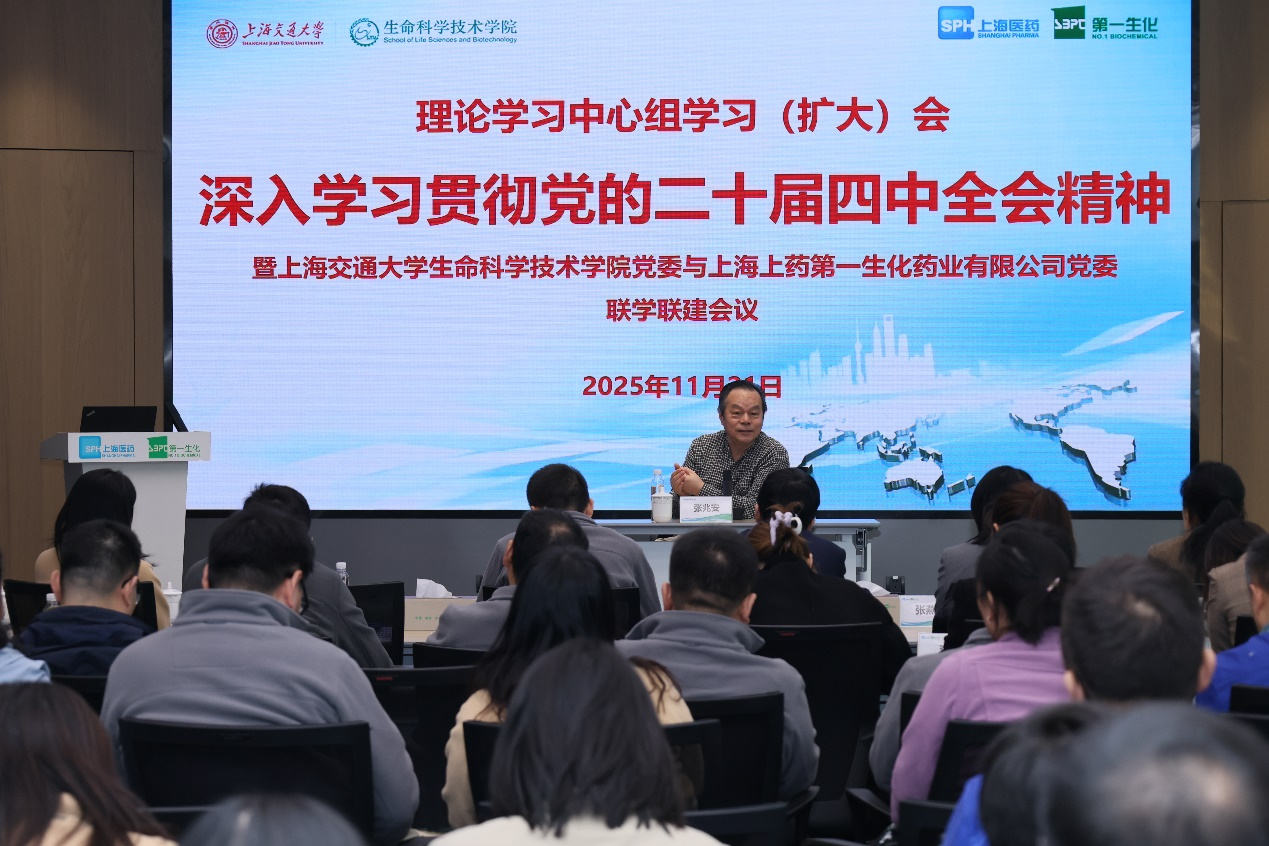 为深化党的二十届四中全会精神学习实效,促进校企产学研融合发展,11月21日,生命科学技术学院院长张雁、党委书记冒巍巍带领党政班子、理论中心组成员、机关科室负责人及专业教师代表前往上海上药第一生化药业有限公司,开展产学研合作对接交流并举行党委理论学习中心组(扩大)学习。此次活动从校企不同视角领会学习二十届四中全会会议精神,搭建校企交流赋能发展平台,着力推动产学研协同创新。